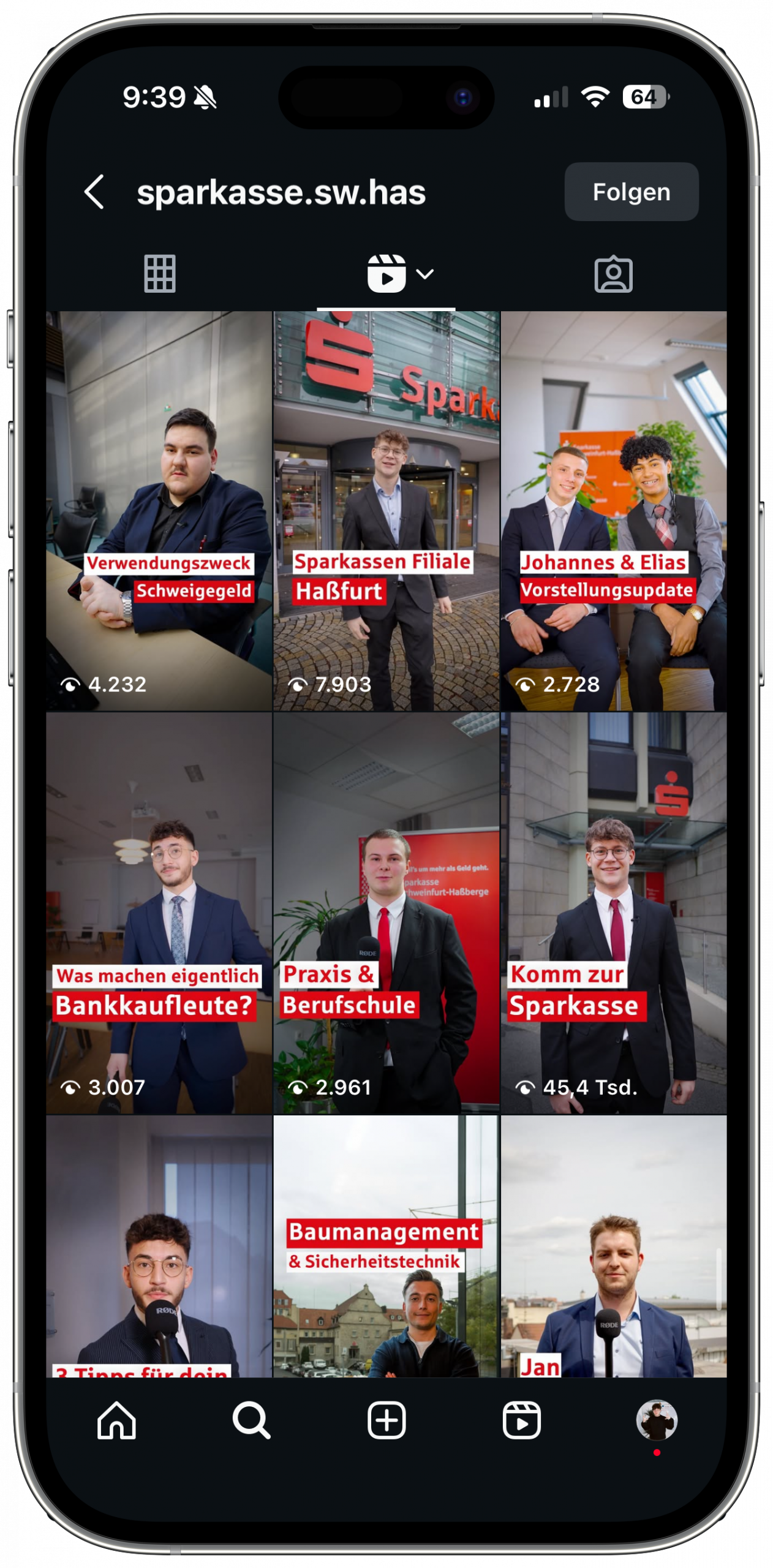 Dies haben wir durch Azubi Content und einzigartige Einblicke in den Alltag der Bank geschafft. Wir haben über 250.000 organische Impressionen alleine durch Reels.
